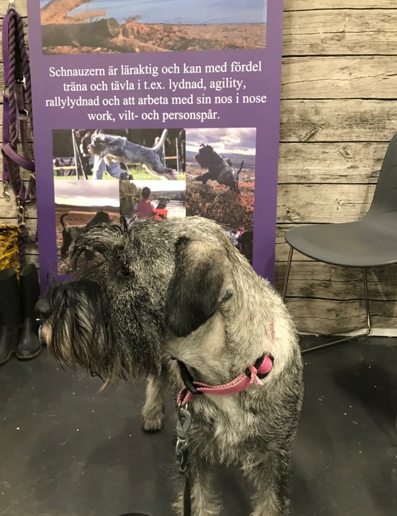 Vi fick jobba också. Husse tyckte det var bra om vi kunde visa alla tvåbeningar vilka fina hundar som schnauzrar är. Anki och Iris jobbade också med det tillsammans med våra kompisar Loona och Alice. Alice är min och Izzas dotter och vi är väldigt stolta över henne.