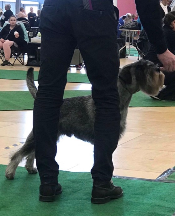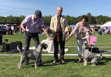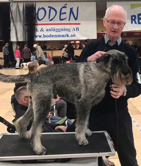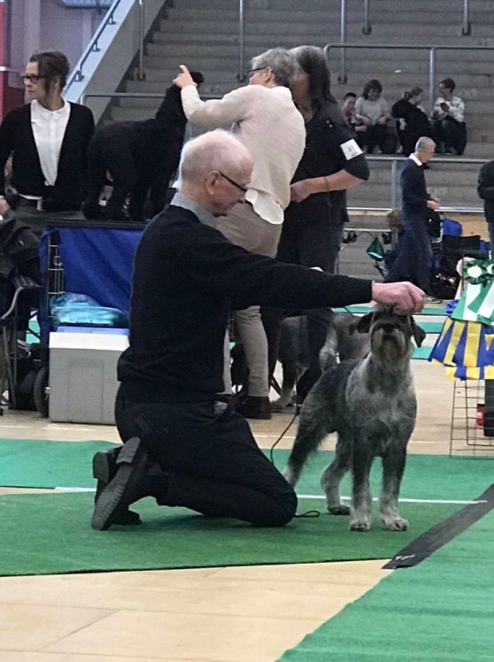 Sedan var vi på utställning och där skulle jag springa och stå fint, fast jag hade lite svårt att koncentrera mig sa husse. Det är ju inte så konstigt för det var så spännande dofter. Särskilt gott luktade min syster söta Wåfflan, men henne fick jag inte nosa på. Det var två domare som skulle humma och klämma på mig. Jag tänkte att jag pussar väl dom också och det gjorde jag. Dom sa att jag var trevlig och snygg, men jag fick ingen rosett, som jag brukar få. Det gjorde ingenting, för det var roligt i alla fall. Förresten är det mest husse som vill ha rosetter.