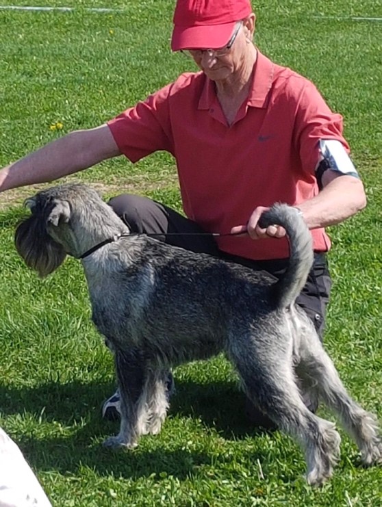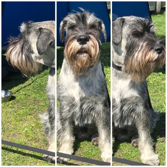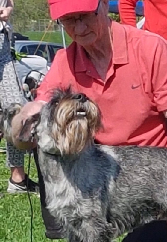 Det var en massa goda dofter där också och jag skulle hälsa på folk och det gjorde jag. Det gör jag jämt. Det kan jag bra. Sedan blev det roliga lekar med nya leksaker och dom kunde jag leka med. Sedan tyckte jag att jag skulle ta och springa och kolla runt lite så det gjorde jag. Husse och dom andra tyckte jag skulle komma tillbaka och det gjorde jag efter en stund, fast det blev en ganska lång stund. Efter det blev det ännu roligare. Jag fick springa efter något som såg ut som en kanin och dom är jätteroliga att jaga och den fångade jag lätt. När jag hade fångat den sprang jag omkring en stund tills dom tyckte jag skulle komma tillbaka. Det hade jag inte tid med just då. Sedan blev det väldigt roligt. Jag fick leka ta fast med alla, men dom fick inte tag i mig, för jag är väldig snabb – schnauzersnabb. En av dom trevliga människorna sprang sedan in i klubbhuset och då blev jag nyfiken och sprang efter. Då var det roliga slut. Jag vet inte om jag var färdigtestad. Dom sa att jag var en väldigt trevlig och rolig hund. Klart jag är. Jag är ju schnauzer och då är man det. Dom ville jag skulle komma tillbaka en annan gång så dom tänkte nog att jag var bra på att MH-testa. Sedan åkte vi hem och husse sa att vi skulle träna inkallning. Det betyder att man ska springa fort till husse och sätta sig vid husses sida. Det kan jag, men ibland har jag inte tid med det.
